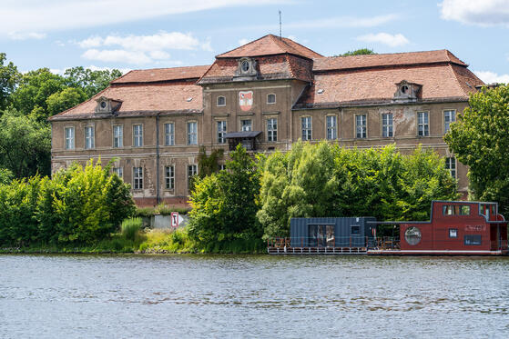 Mit der Brücke im Rücken laufen wir ein paar Meter geradeaus und biegen bei der ersten Gelegenheit nach rechts in die Kietzstraße ab, laufen diese bis zum Ende und erreichen so die Bundesstraße 1. Hier nach rechts und über die Brücke laufen. Am Ende der Brücke finden wir wieder Häuser am Wasser. Dahinter verläuft eine Straße. Auf diese Straße biegen wir nach rechts ab, folgen ihr und biegen an ihrem Ende nach rechts ab. Die nächste Straße macht einen Bogen nach rechts und endet auf der anderen Seite der unpassierbaren Brücke. Kurz vor der Brücke, auf der linken Seite, führt eine Treppe gefühlt ins nirgendwo. Es gibt aber einen Trampelpfad direkt am Wasser und von dort einen Blick auf das Schloß Plaue.