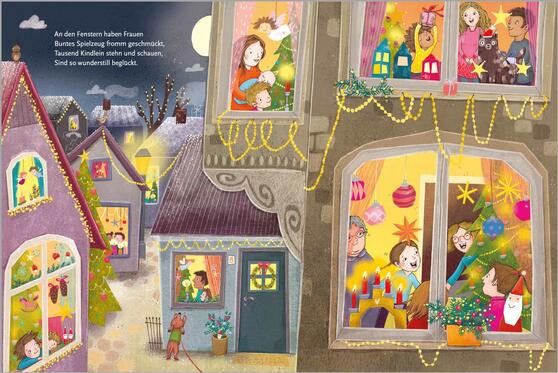 Farbenfroh und festlich stimmt uns das Cover auf dieses schöne Weihnachtsbuch ein. Es ist Heiligabend. Wir sehen eine fröhliche Familie unter einem Tannenbaum. Die Kinder bestaunen die Lichter am Baum und die Geschenke sind noch nicht ausgepackt. Niemand ist unterwegs. Die Weihnachtsmarktbuden auf dem Marktplatz sind geschlossen. Die Straßen sind ruhig und sehr festlich. Eine ganz besondere Stimmung scheint über den Gassen zu schweben.