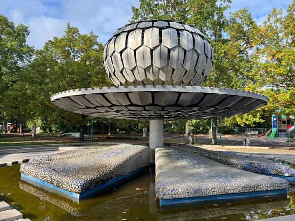 Innenräume prägen das Erscheinungsbild. Der „Kugelbrunnen“ von Günter Stahn,